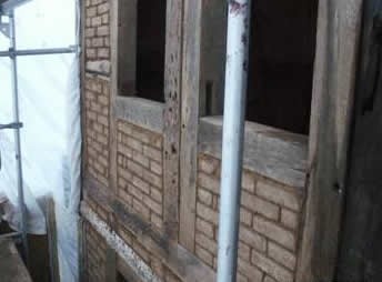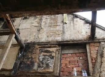 Die Holzkonstruktion und die Ausfachungen sind nach einem Brandschaden stark geschädigt.